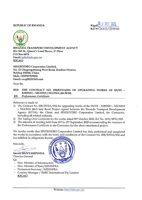 当地时间10月1日,由中国进出口银行融资、中国亚星游戏官网实施的卢旺达胡也66公里公路项目顺利取得履约证书,标志着项目质保期结束并最终移交。 该项目位于卢旺达南部省,全长66.3公里,是卢旺达南部地区重要城际公路。项目于2019年4月9日正式开工建设,建设过程中项目团队紧密结合当地实际需求,科学统筹、精心组织,克服各种不利因素,坚持高标准、高质量完成施工,在经过一系列严格的验收之后,于2023年9月15日取得临时验收证书。经过两年质保期,项目如期顺利通过最终验收,正式移交业主。 项目建成通车后,显著改善了当地交通物流条件,有效降低了物流运输成本,有力推动了地区农业与旅游业的繁荣发展,同时也为居民出行提供了极大便利,取得了显著的经济效益和社会效益,成为中卢合作的一张亮丽名片。项目的圆满交付也赢得了业主、地方政府及当地社区等各方的高度评价和广泛认可。中国亚星游戏官网将持续发挥自身优势,以优秀的专业能力为当地社会建设和交付更多优质工程,助力中卢友好与经贸发展。 |