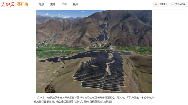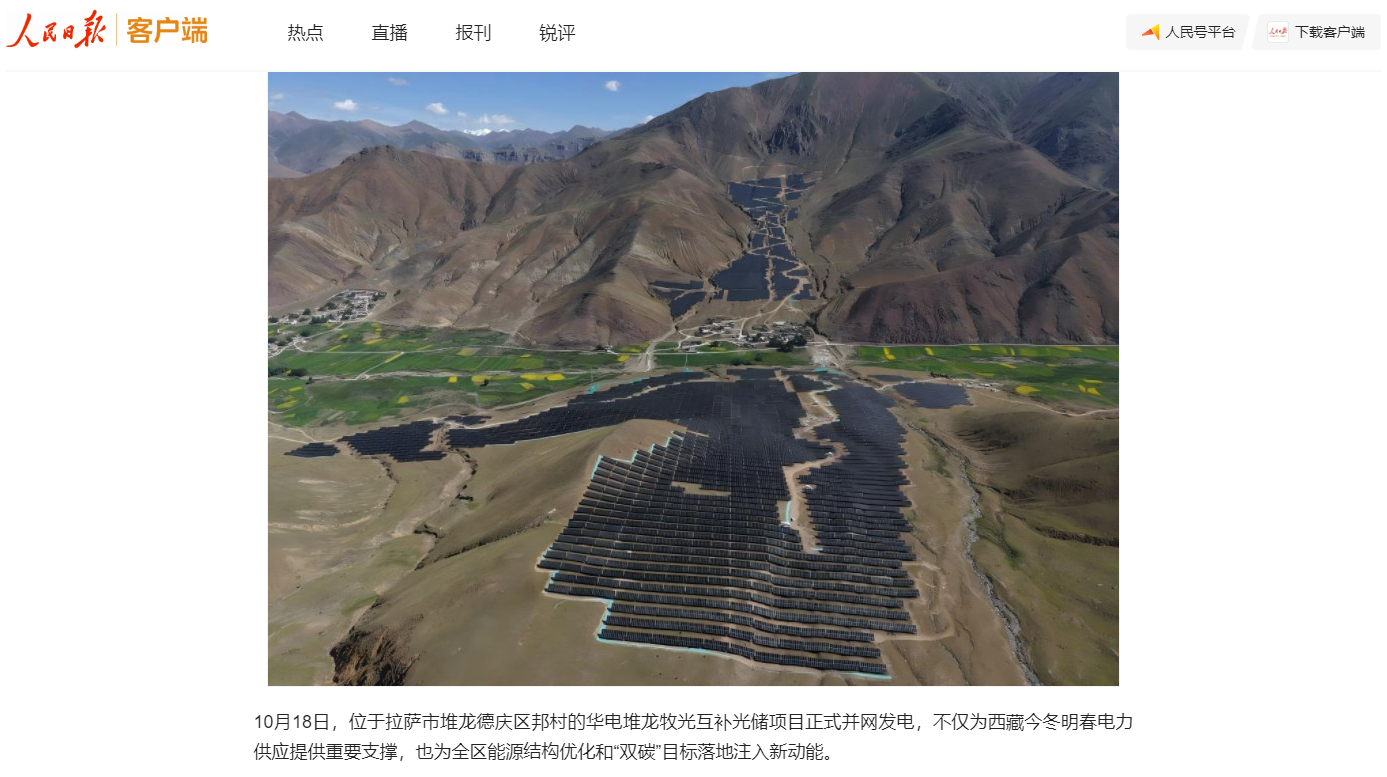 《人民日报》客户端:西藏拉萨牧光互补光储项目正式并网发电