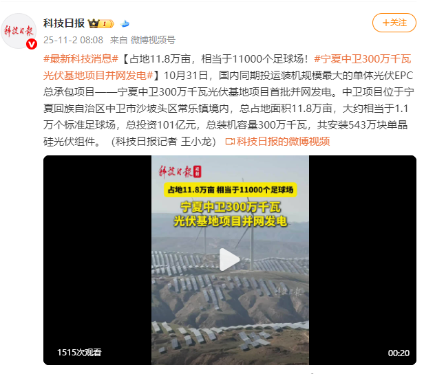 10月31日,国内同期投运装机规模最大的单体光伏EPC总承包项目——宁夏中卫300万千瓦光伏基地项目首批并网发电。中卫项目位于宁夏回族自治区中卫市沙坡头区常乐镇境内,总占地面积11.8万亩,大约相当于1.1万个标准足球场,总投资101亿元,总装机容量300万千瓦,共安装543万块单晶硅光伏组件。